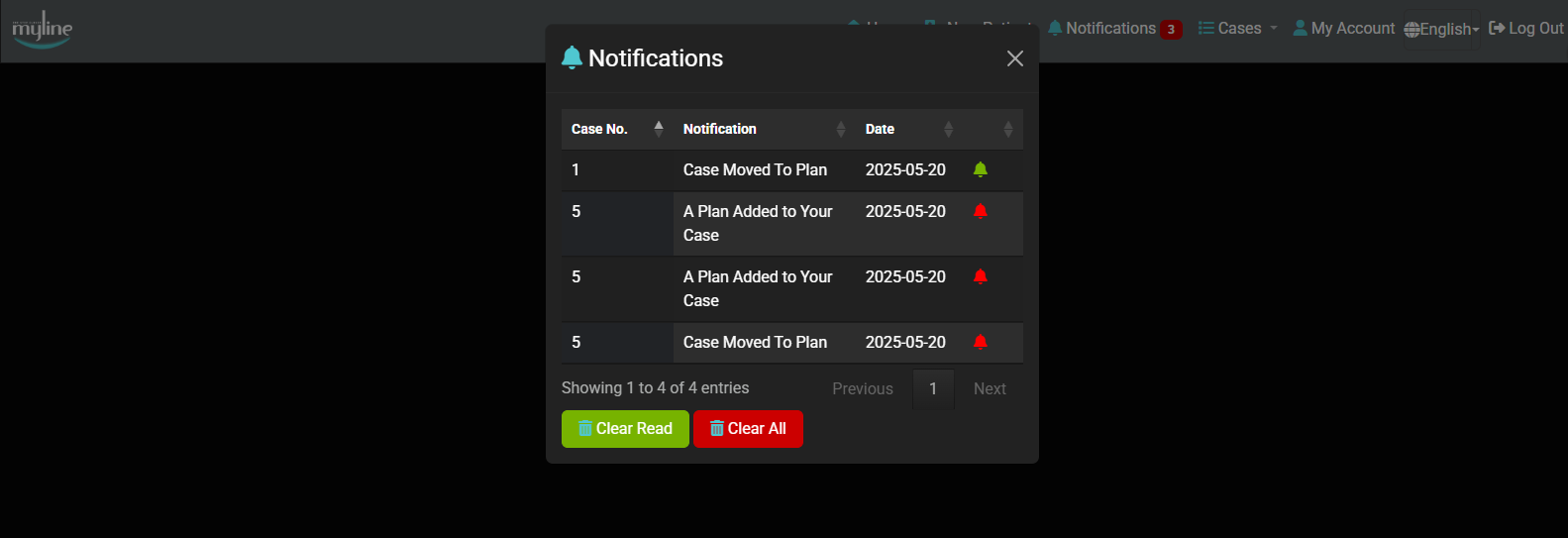 Clear Read (Green Button): Click this button to remove all the notifications that you have already seen (the ones with a green flag).Clear All (Red Button): Click this button to permanently remove all notifications from your list, including any you have not read yet.